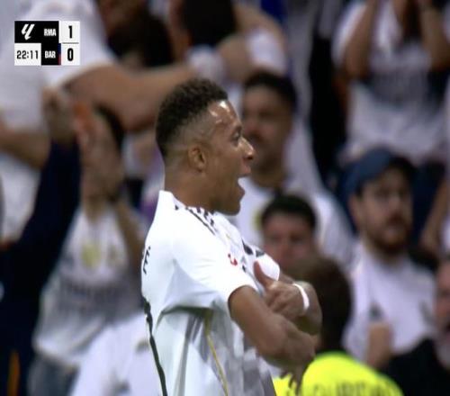此役主场对阵巴塞罗那,姆巴佩在比赛第22分钟破门,为皇家马德里取得1-0领先。