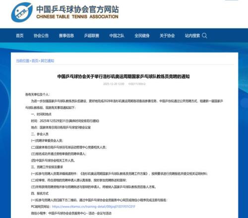 中国乒乓球协会官网于12月20日正式发布了《中国乒乓球协会关于举行洛杉矶奥运周期国家乒乓球队教练员竞聘的通知》,标志着为期三天的新周期国家队教练员公开竞聘工作将于本月29日正式启动。