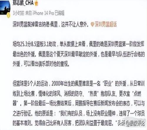 当时,深圳男篮跟队记者郑志鹏发文提到佩里的情况点评