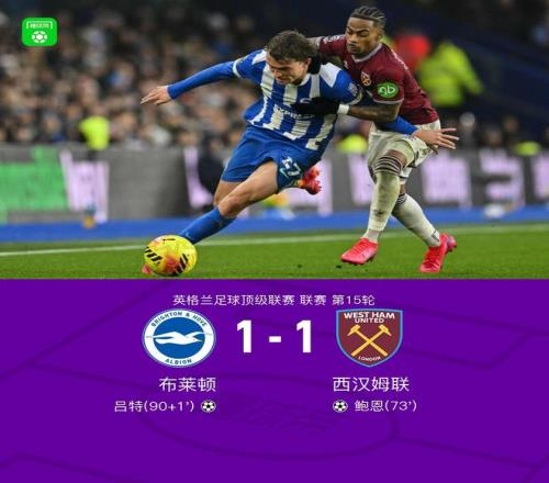 北京时间12月7日,英超联赛第15轮,布莱顿坐镇主场迎战西汉姆联。上半场,帕奎塔远射造险;下半场,威尔逊助攻,鲍恩倒地情况下小角度破门。随后,吕特乱战中小角度破门扳平比分。费布鲁亨屡献神扑。最终双方1比1握手言和。